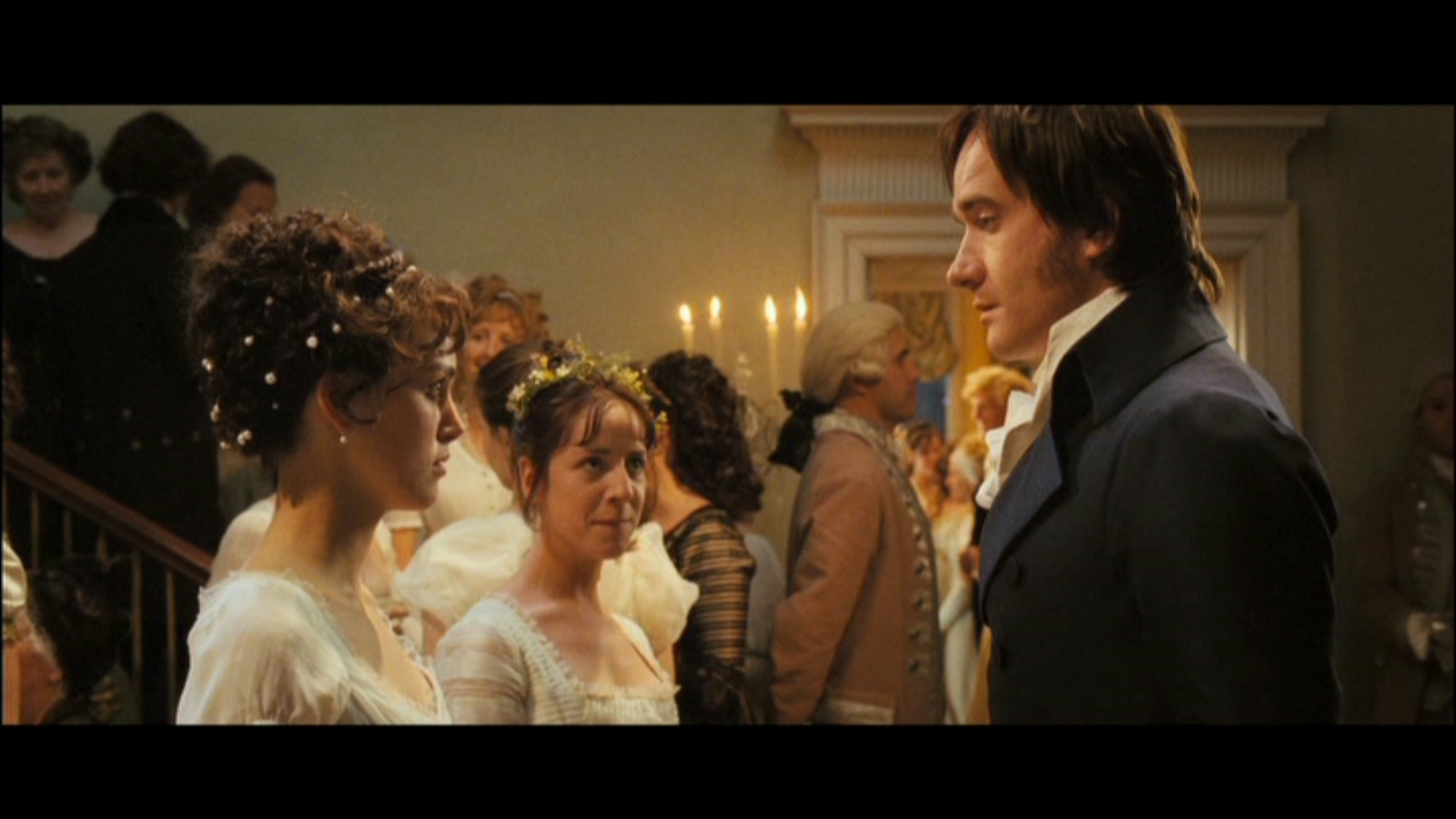This is the scene where Mr. Bingley and Mr. Darcy were talking to Mrs. Bennet, Jane and Lizzie in the ball. In passing, Lizzie mentioned that poetry had the power to drive away love, to which Mr. Darcy replied, “I thought that poetry was the food of love.” Lizzie replied that it may be the case if it’s a “fine stout love,” but not if it is merely a “vague inclination,” at which point a poor sonnet can be counted upon to kill it outright. Mr. Darcy replied, “So what do you recommend to encourage affection?” probably unconsciously planning to file the information for future reference, should he wish to encourage Lizzie’s affection. Lizzie quickly replied: “Dancing. Even if one’s partner is barely tolerable.” then stalked off. This must have suprised him since it shows that she heard his earlier comment that she was “barely tolerable,” and she had the guts to call him to it.