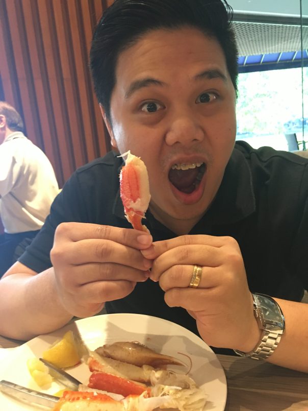 My hubby ended up eating mostly crab legs (claws?) and shrimp from the cold seafood spread. I kept trying to convince him to try something else – something I don’t eat myself – like maki or sashimi or laksa – but he was way too happy with what he was eating and didn’t want to explore much. Look at how happy he is.